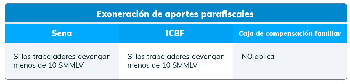 Si en una empresa los trabajadores contratados devengan menos de 10 Salarios Mínimos Mensuales Legales Vigentes (SMMLV), la empresa estará exonerada de realizar aportes parafiscales referentes al SENA y al ICBF.