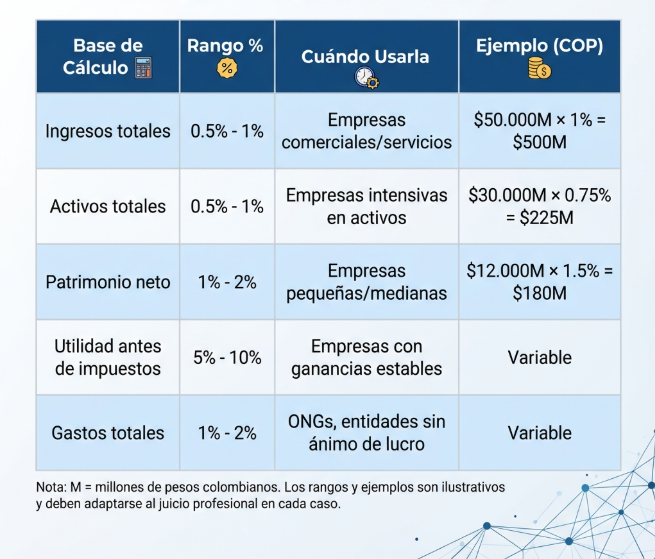 De acuerdo con las NIA y las prácticas usuales, la materialidad se calcula usando un porcentaje de cifras clave. Los rangos comunes usados para determinar la materialidad en conjunto suelen ser: