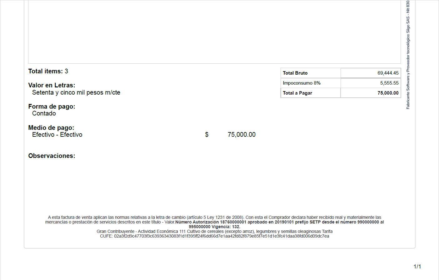 Aquí te mostramos un ejemplo cuando generas facturas utilizando el software de Siigo. La primera imagen corresponde a una factura normal y en la segunda tienes la factura electrónica con los requisitos exigidos por la DIAN.